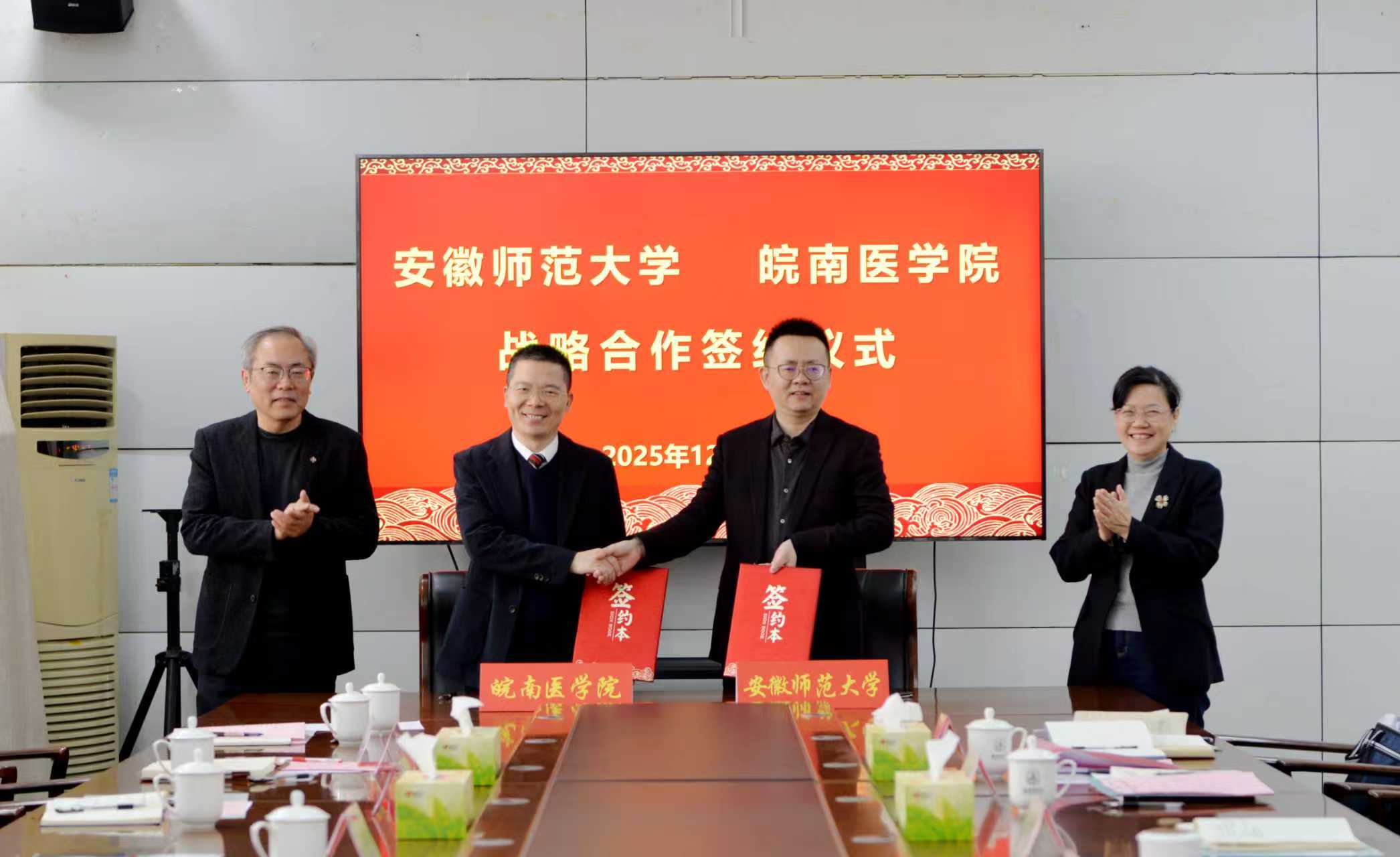 12月18日上午,安徽师范大学与皖南医学院举行战略合作签约仪式。学校党委书记蒋家平,党委副书记、校长熊宇杰;皖南医学院党委书记夏劲松,党委副书记、院长姚应水,党委常委、副院长余结根出席签约仪式。两校相关职能部门及学院负责人参加会议。